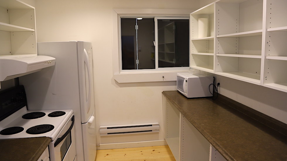 A separate small kitchen provides users with a stove, fridge, and microwave.