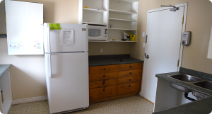 This cabin has a separate kitchen which contains 2 electric stoves, microwave and a fridge.